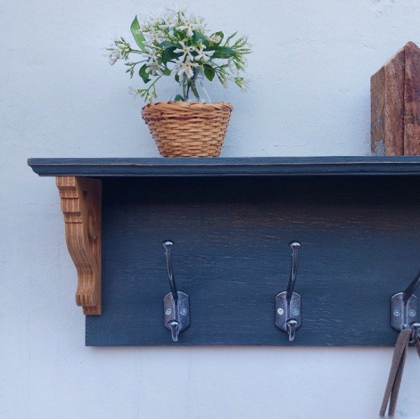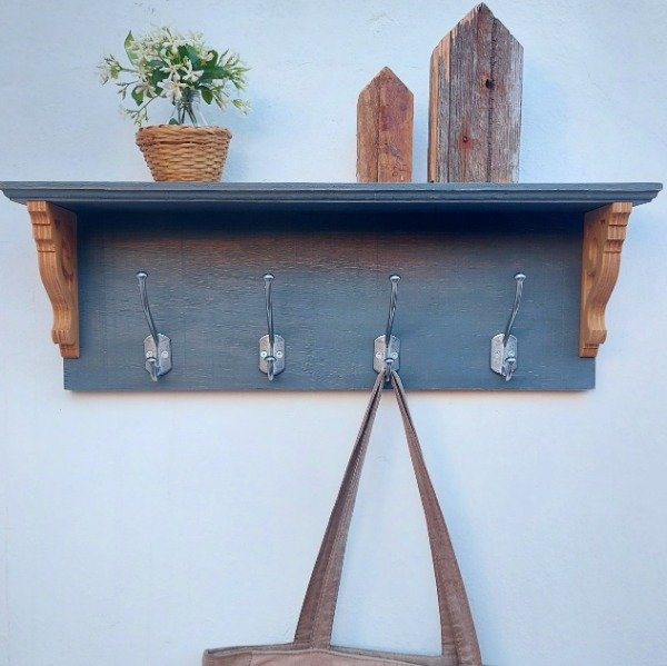 Perchero estilo campo con el detalle de ménsulas de madera caladas de estilo colonial.