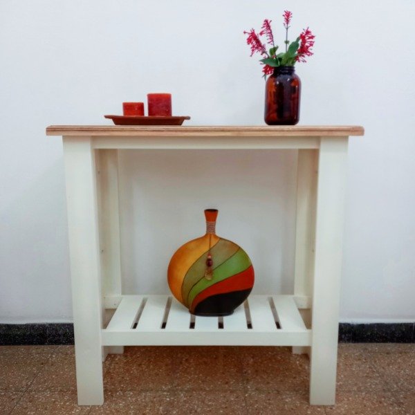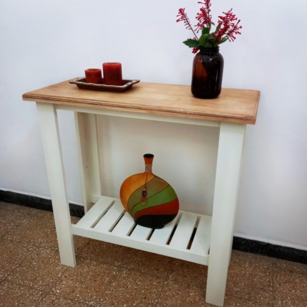 Medidas de la mesa de la foto: 0.90m de largo x 0.90m de alto x 0,30m de profundidad. Pintada en color natural + tabla de madera